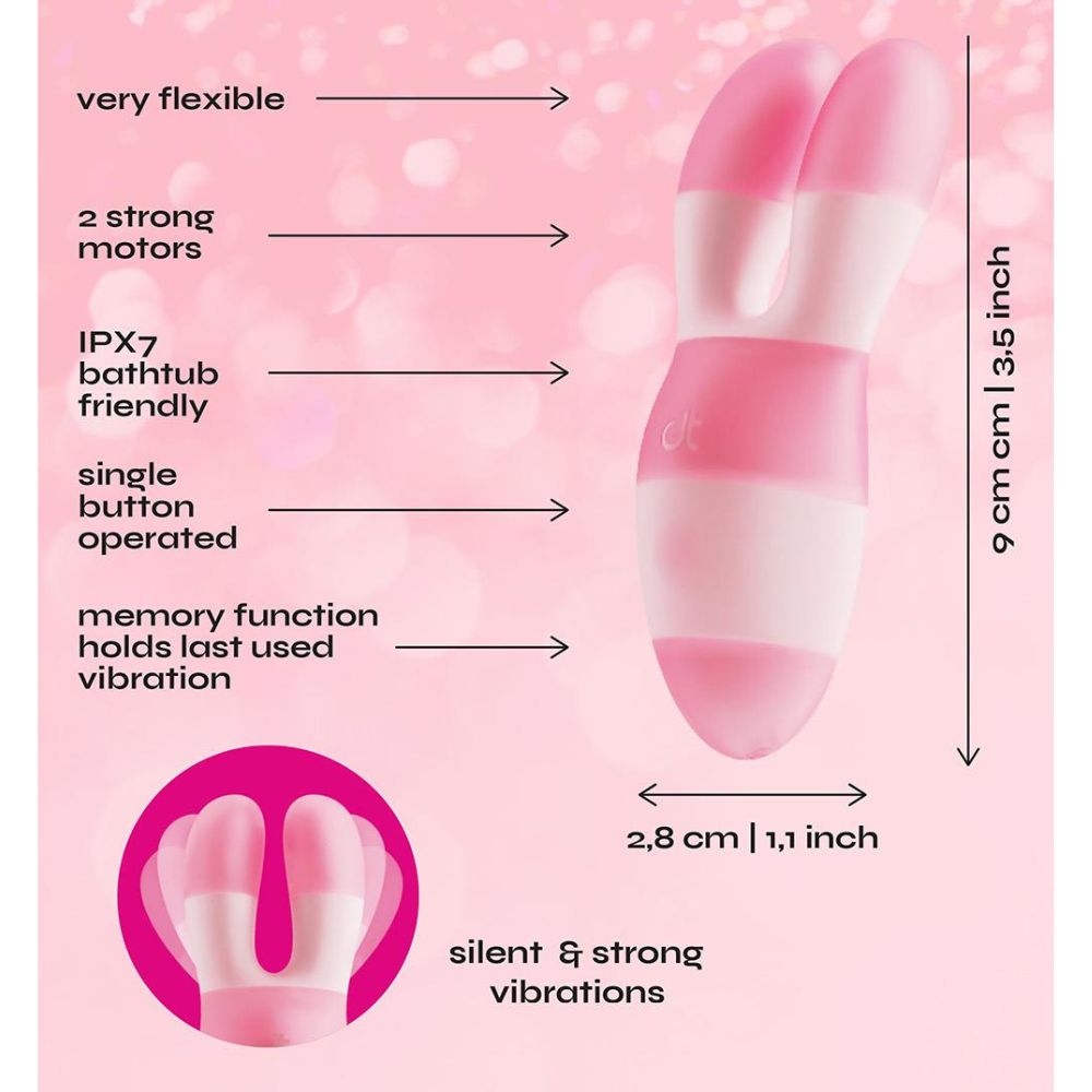 Läckert utformad kittlare med 2 kraftfulla motorer. Ger tystlåtna och starka vibrationer i 7 olika rytmer och 3 hastigheter. De två stimulerings-armarna är flexibla och anpassar sig till din kropps konturer och ger riktad njutning exakt där du vill ha det.